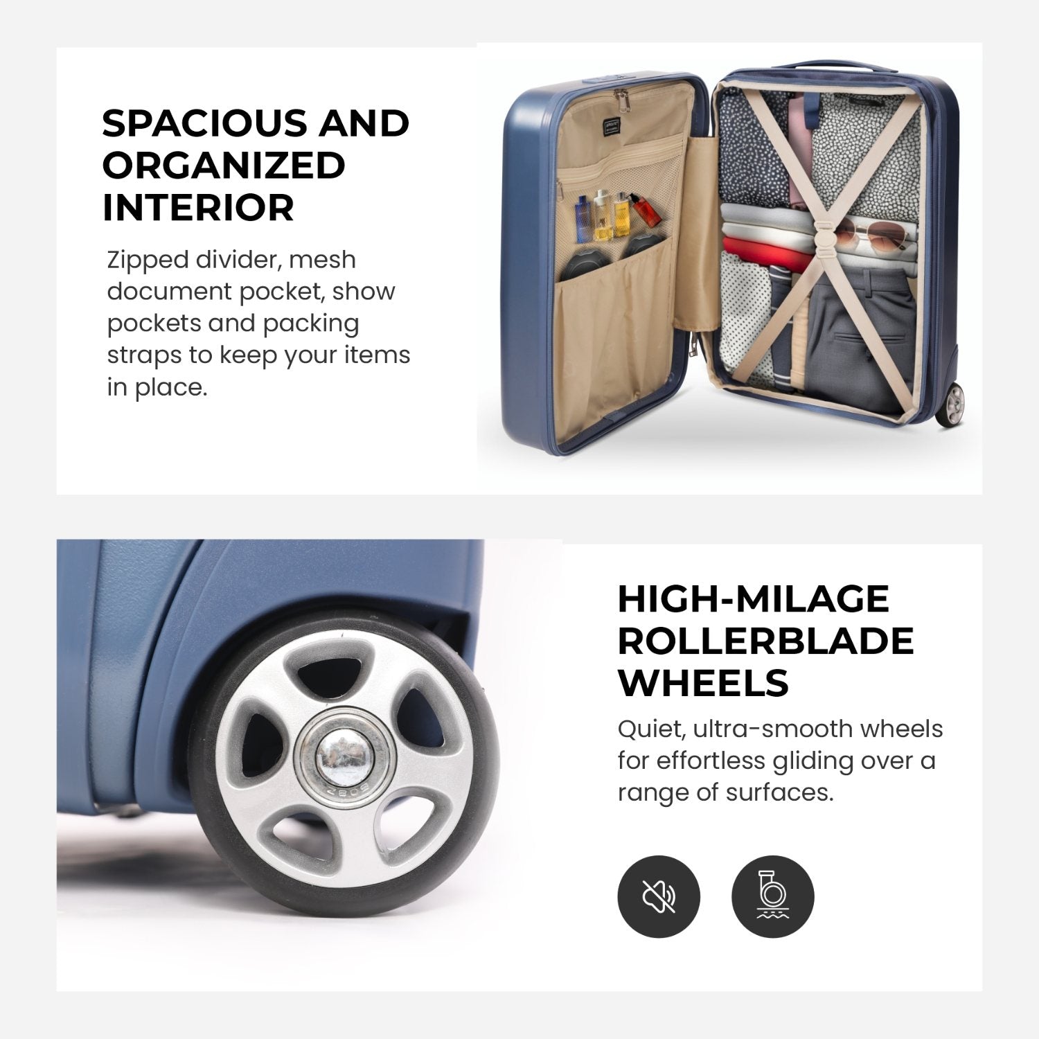 Smooth 2-Wheel Stability: Fitted with rollerblade-style wheels for quiet, effortless rolling, plus a stabilising stopper to keep the case upright in queues and during transfers.