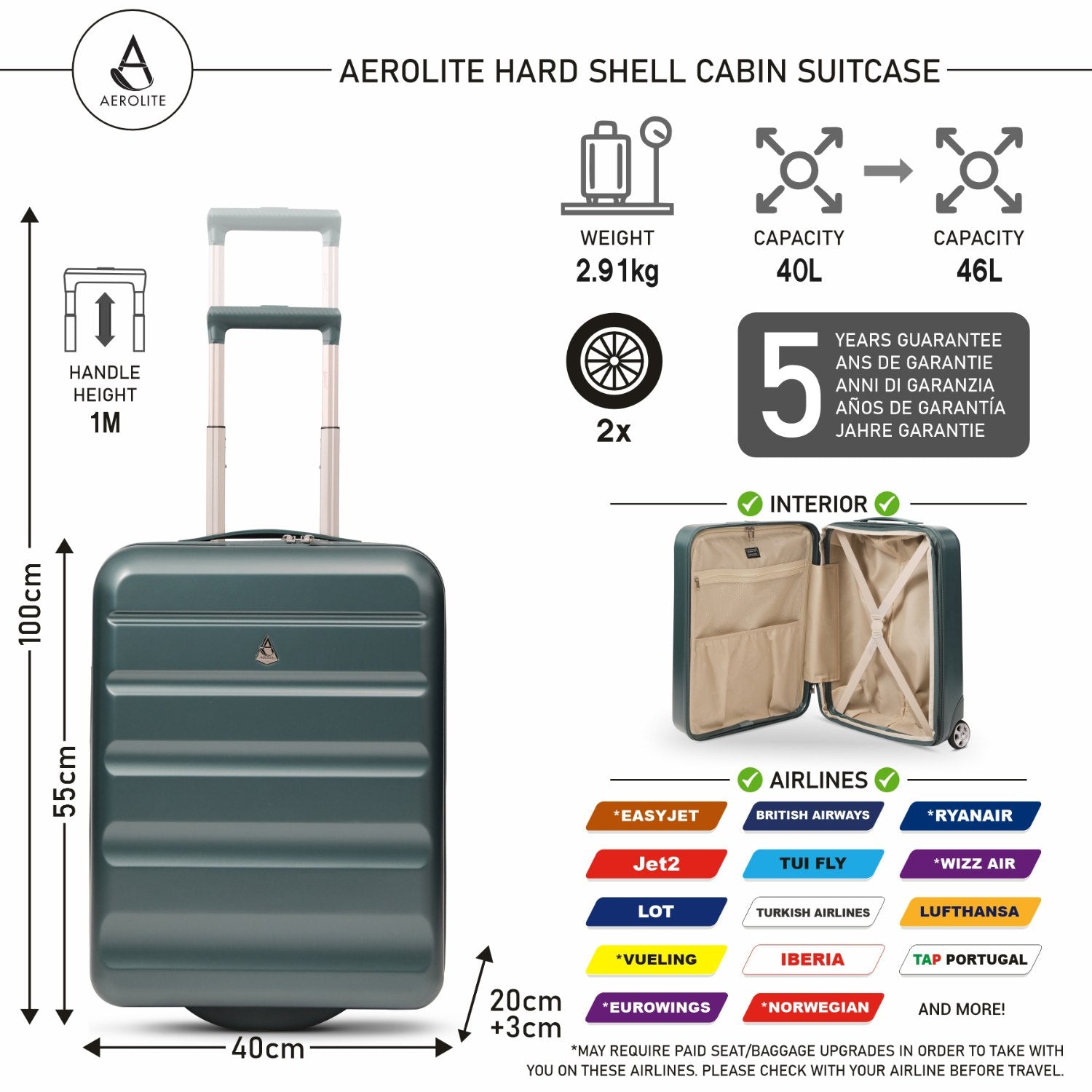Aerolite Expandable Cabin Suitcase 55x40x20cm Ryanair Priority Max Size, Expands to 55x40x23cm for Lufthansa & Wizz Air Priority, Hard Shell 2-Wheel Carry-On Trolley with TSA Lock, 40–46L Capacity, Forest Green
