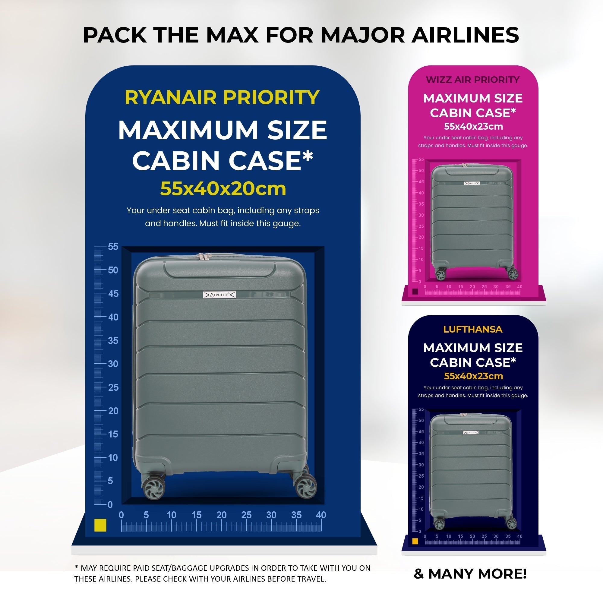 - Airline-Approved Cabin Size: The 21" cabin luggage meets airline cabin bag requirements, fitting Ryanair, Wizz Air, TUI, Lufthansa, Turkish Airlines, and more. Size: 55x40x20cm (unexpanded), expands to 55x40x23cm.
